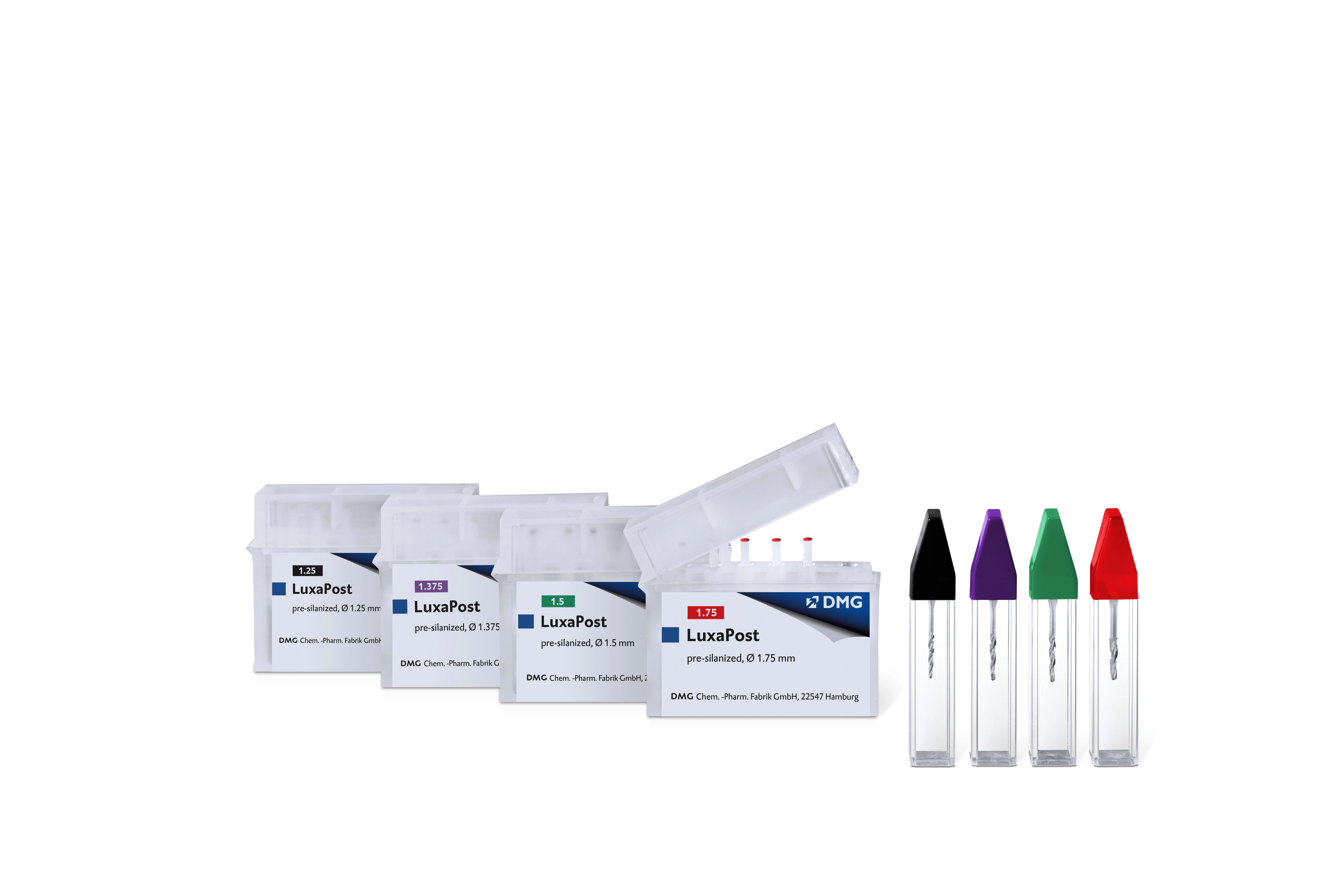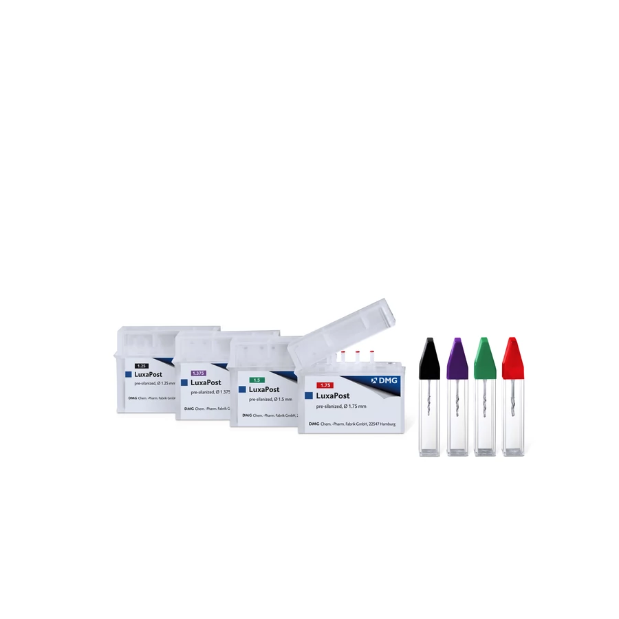 The LuxaPost is a glass fibre-reinforced composite root pin with dentine-like flexural modulus. Its high flexural strength and conical shape are similar to the natural tooth. This minimises the risk of fracture. For this glass fibre-reinforced root , we should use Luxapost Drills.