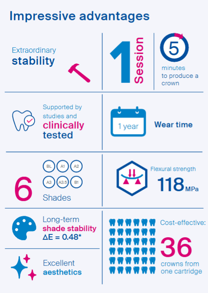 It is an excellent option for both dentists (chairside applications) and dental technicians for the fabrication of long-term temporary restorations.